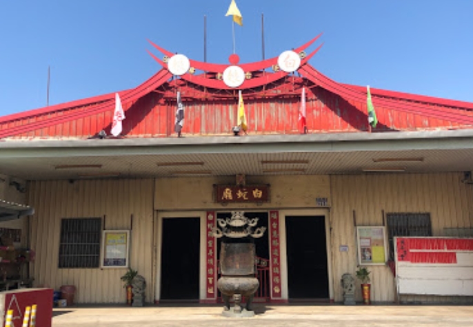 白蛇廟又稱財神廟,成立於民國九十一年五月,五月五日端午節為白娘娘聖誕干秋日。本廟創辦人羅欽師在民國八十一年時,因緣際會於友人處獲得一母白蛇,兩年後機緣湊巧於南台灣又獲得一公白蛇,天作之合共組白蛇家庭,結縭之後,玄妙的是每年固定在端午節前後產卵,延續至今已子孫滿堂。因白蛇深具靈性,亦為吉祥幸運的靈物,世界各地十方善信絡繹不絕慕名前來膜拜。