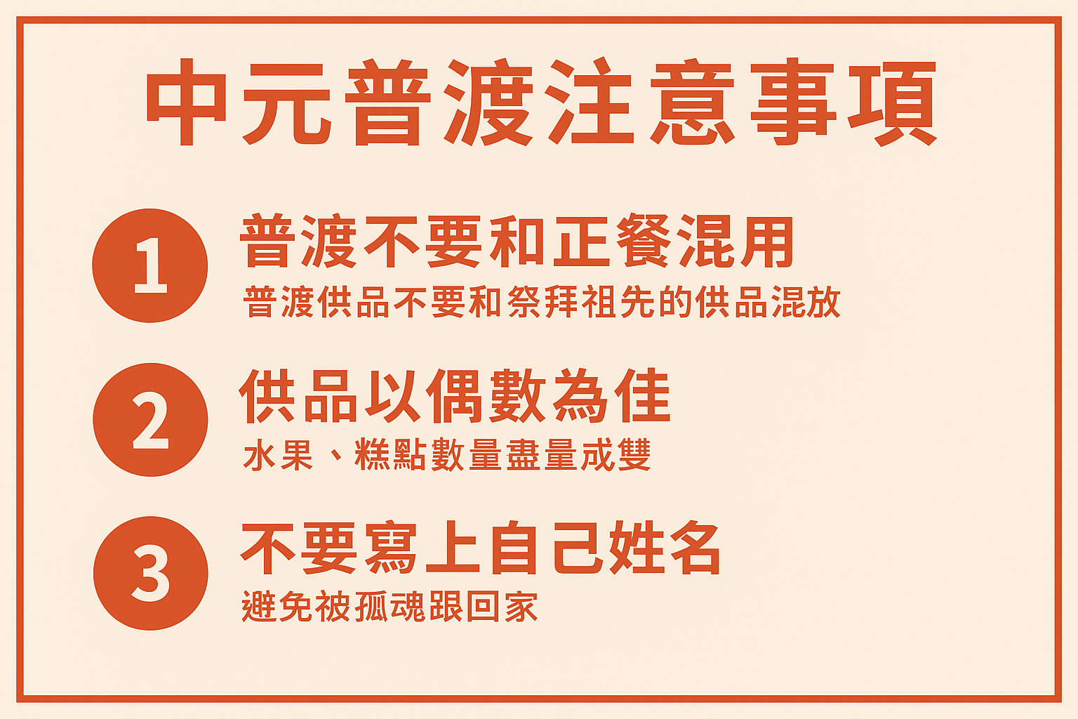 普渡雖是積德行善,但若觸犯禁忌,可能造成反效果。以下為 中元普渡注意事項: