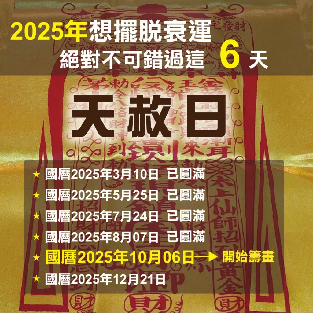 天赦日全年度並不多,而下半年又剩不多。10/6 這天正好是中秋,也是最後幾次能在本年度做大規模祈福法科的好日子。錯過了,可能要等到來年才能有同樣強能量的機會。 - 過去法科成功案例見證